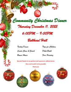 Please see the attached poster for the Community Christmas Dinner happening on December 11th, 2025, from 6 PM to 9 PM at the Bullhead Community Hall.
