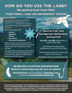 Please see the attached poster and information below for the Consultations Traditional Land Use Engagement Session at the Grey Eagle Hotel – Big Plume Room on March 25th & 26th, 2026.