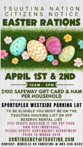 Please see the attached poster for this year’s Easter Rations. $100 Safeway gift cards and hams will be distributed on April 1st & 2nd, 2026, from 10 AM – 5 PM at the 7 Chiefs Sportsplex & Chief Jim Starlight Center – Westside Parking Lot.