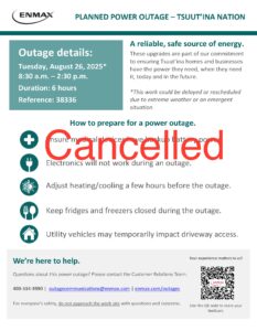 Please be advised that the power outage # 38336 planned for Tuesday, August 26, 2025, has been cancelled, as ENMAX is taking extra care to review the design for this work. Once this review is finished and approved, we will share the new outage date with you.