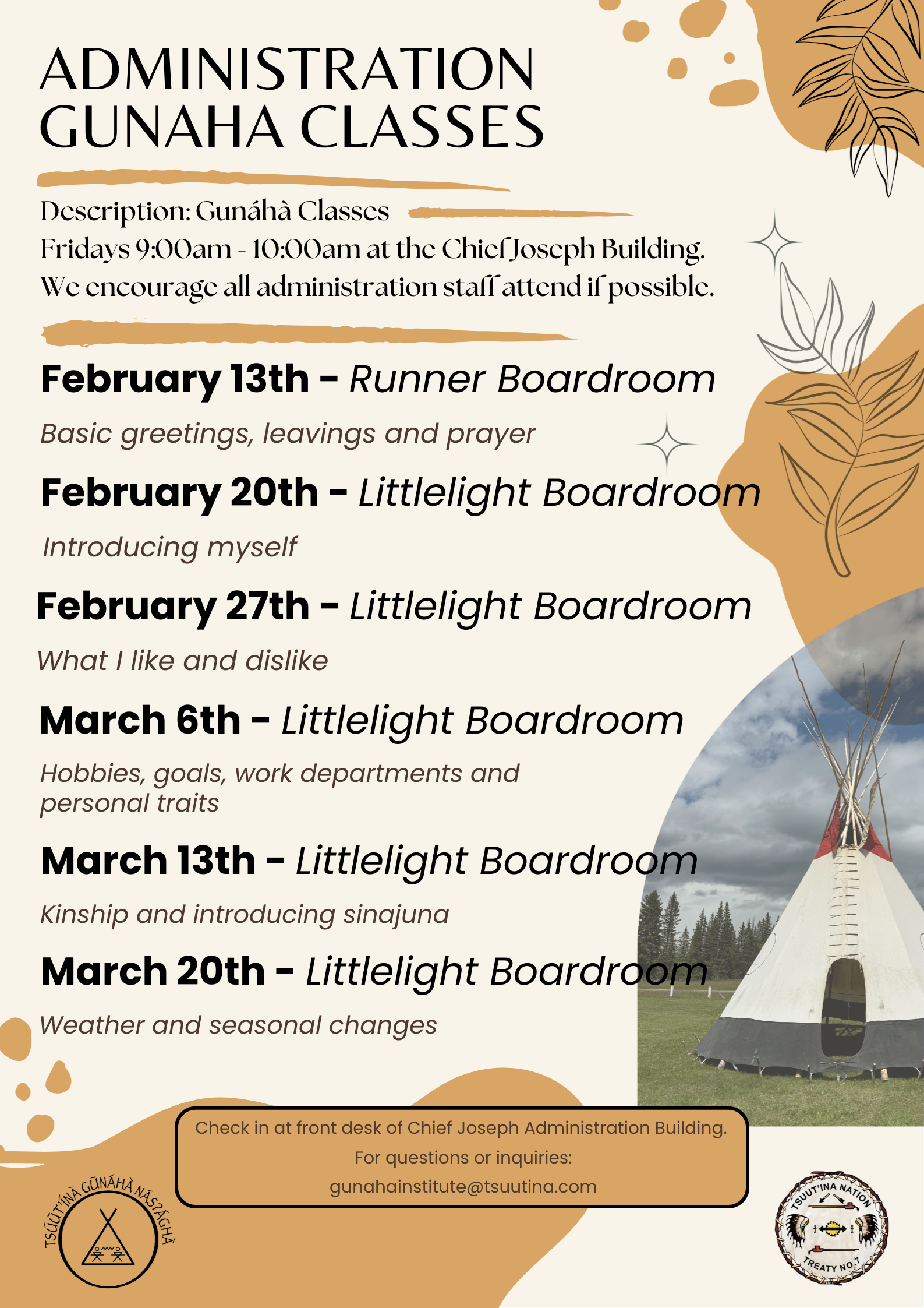 9:00 am - 10:00 am TSÚUT’ÍNÀ GUNÁHÀ ADMINISTRATION CLASSES February 13 @ 9:00 am - 10:00 am TSÚUT’ÍNÀ GUNÁHÀ ADMINISTRATION CLASSES TSÚUT’ÍNÀ GUNÁHÀ ADMINISTRATION CLASSES
