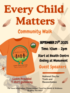 Join us on September 29th, 2025, from 10:00 AM – 2:00 PM as we walk together from the Tsuut’ina Health Center to the Monument in honour of Every Child Matters.
