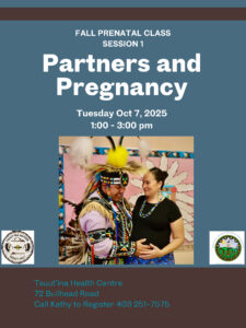 Please see the attached poster for the upcoming Prenatal Class – Session one on Tuesday, October 7th, 2025, from 1 PM- 3 PM at the Tsuut’ina Health Centre. To register, call Kathy at 403 251-7575.