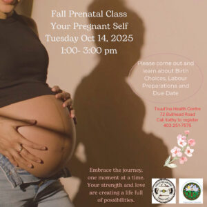 Please see the attached poster for the upcoming Prenatal Class – Session Two on Tuesday, October 14th, 2025, from 1 PM – 3 PM at the Tsuut’ina Health Centre. To register, call Kathy at 403 251-7575.