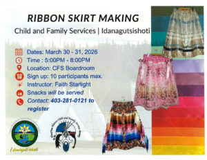 Family Support is hosting Ribbon Skirt making classes today, March 30th & 31st, 2026. Location is at Child & Family Services Big Boardroom from 5:00 pm to 8:00 pm.