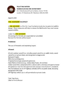 Please be advised that there is a fire advisory in effect for Tsuut’ina Nation lands due to potential wildfire danger. These measures will help to reduce the likelihood of any new human-caused wildfire. Please see the notice below.