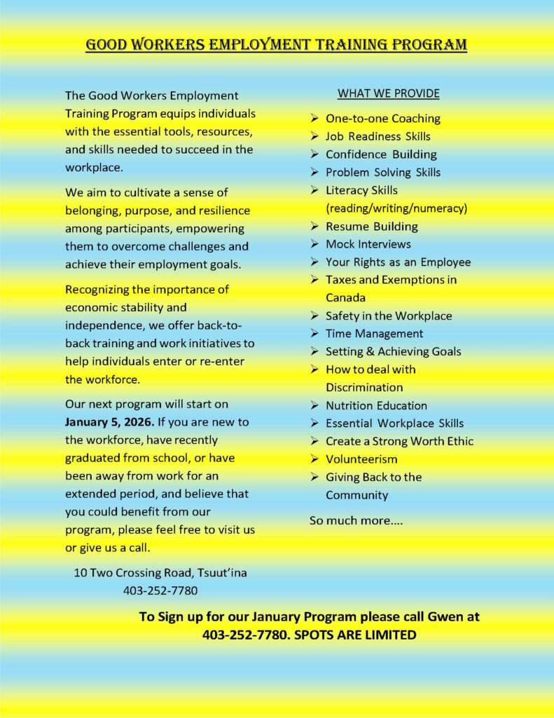 Please see the attached information about the Good Workers Employment Training Program. The next program will begin January 6th, 2026.