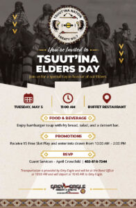Please see the attached poster for Tsuut’tina Elders Day. Grey Eagle Resort & Casino is hosting a lunch to honour the Tsuut’ina Elders on May 5th, 2026, at 11 AM in the Buffet Restaurant.