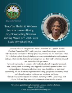 Please be advised that Tsuut’ina Health & Wellness is now offering Grief Counselling Sessions starting on March 17th, 2026, with Lucia Onyeakazi, RCC.
