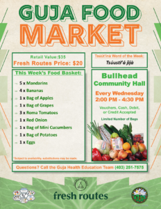 Please see the attached Guja Food Market list for today, April 22nd, 2026, from 2 PM – 4:30 PM at the Bullhead Community Hall.
