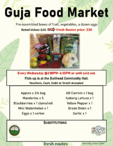 Please see the attached Guja Food Market list for today, October 8th, 2025, from 2 – 4:30 PM at the Bullhead Community Hall.