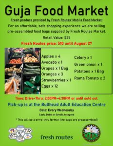Please see the attached Guja Food Market list for today, July 23rd, 2025, from 2 PM – 4:30 PM at the Bullhead Adult Education Centre.