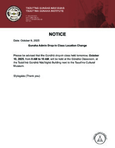 Please be advised that the Gūnáhà drop-in class held tomorrow, October 10, 2025, from 9 AM to 10 AM, will be held at the Gūnáhà Classroom, at the Tsúūt’ínà Gūnáhà Násʔághà Building next to the Tsuut’ina Cultural Museum.