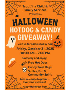 Please see the attached poster for the Halloween Hotdog & Candy Giveaway. Tsuut’ina Child and Family Services will be serving hotdogs and candy from 10 AM – 2 PM on October 31st, 2025.