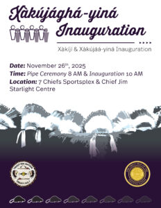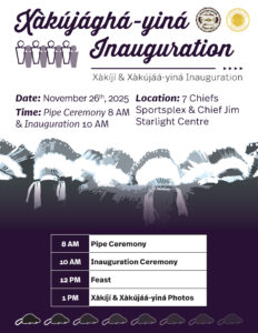 Please see the attached notice and agenda for the 2025 Head Chief & Minor Chiefs Inauguration. The Inauguration will take place on Wednesday, November 26th, 2025, at the 7 Chiefs Sportsplex & Chief Jim Starlight Centre.