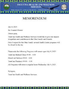 Please be advised that the Tsuut’ina Health Centre will be closed on Tuesday, July 8th, 2025. Tsuut’ina Health and Wellness Services would like to give our deepest sympathies and condolences to the Otter Family and Friends.