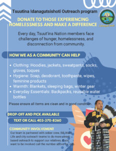 Idanaguts’ishoti Outreach will be collecting donations for our relatives experiencing homelessness in the Urban area. Drop off and pick up of items can be arranged by texting or calling 403-370-8260.