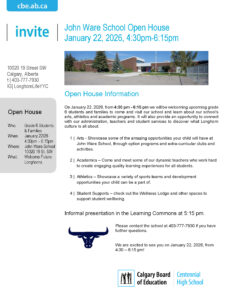 Please see the attached invitation for the John Ware School Open House on January 22nd, 2026, from 4:30 PM – 6:15 PM.