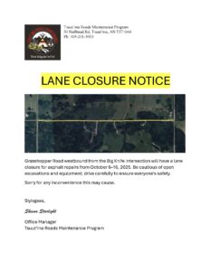 Please see attached notice for ongoing & upcoming lane closures in Tsuut’ina.