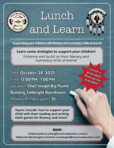 Please see attached for information on The Tsuut’ina Education “Lunch and Learn”, happening October 28th, 2025, 12:00-1:00 PM at the Chief Joseph Big Plume Building (Littlelight Boardroom). For more information or to RSVP, please Contact: o.asher@tsuutinaeducation.com or katherine.macdougall@tsuutinaeducation.com
