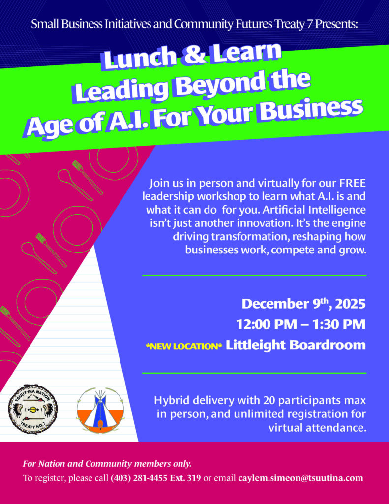 Please see the attached poster for the Lunch & Learn: Leading Beyond the Age of A.I. For Your Business, presented by Small Business Initiatives and Community Futures Treaty 7, happening on December 9th, 2025, 12:00 PM – 1:30 PM at Littlelight Boardroom (Chief Joseph Big Plume Administration Building) and Online.