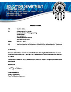 Please see the attached memo regarding Tsuut’ina Education staff attendance at the 2026 First Nations Educators’ Conference.