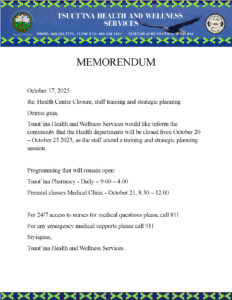 Please be advised that the Health departments will be closed from October 20th to 23rd, 2025, as the staff attend a training and strategic planning session. Please see the attached memo for more information on programs and services that will remain open.