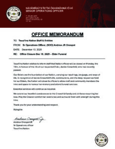 Please see memorandum as the Chief Joseph Big Plume Administration Building and affiliated offices will be closed on Monday, December 15th, 2025, out of respect for Late Elder Jackie Crowchild. We are sending our prayers and condolences to the Crowchild Families during this time.