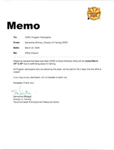 Please see the attached memo regarding Sparrows Nest (CERC & Good Workers) office closure on March 25th – 26th, 2026.