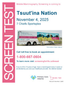“We would like to announce that there will be a mobile mammogram screening event on November 4th, 2025 at the 7 Chiefs Sportsplex. This is an opportunity for members of the community to screen for breast cancer. To book an appointment please call 1-800-677-0604.”