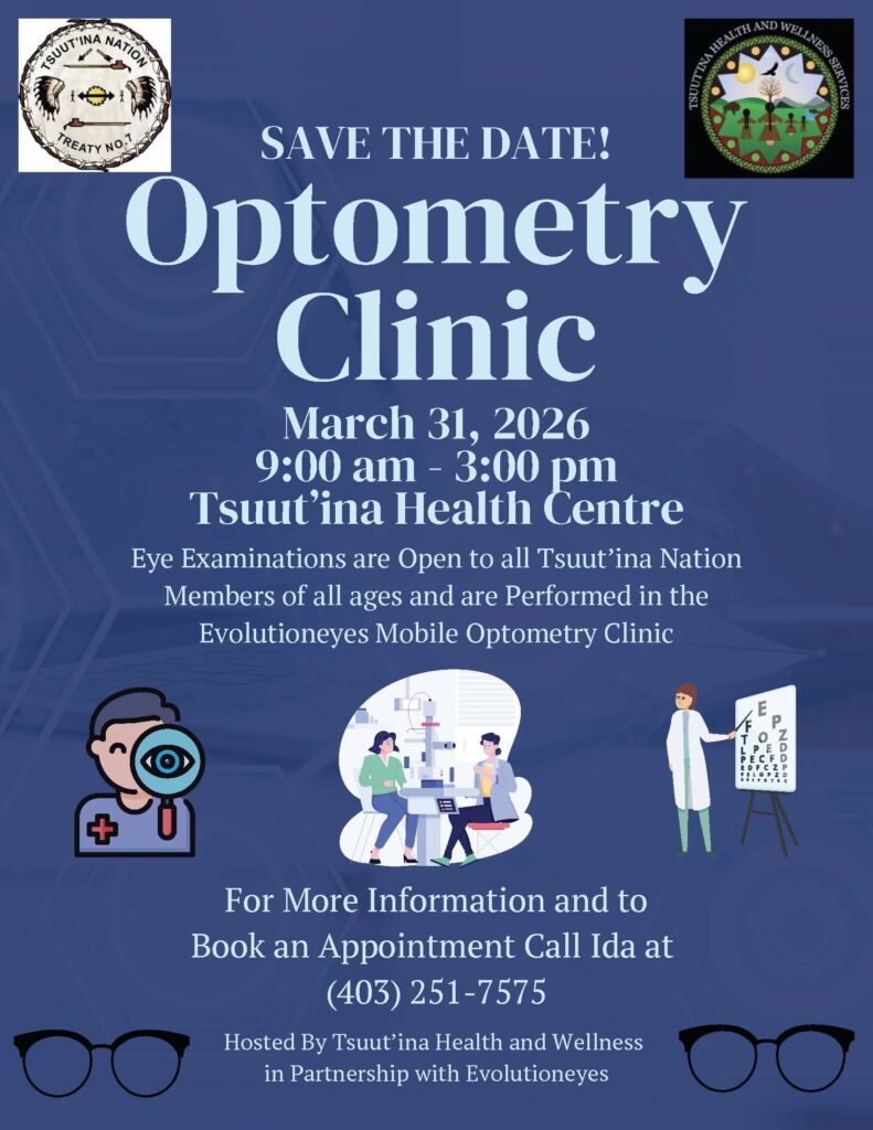 The next Mobile Optometry Clinic is onMarch 31st, 2026, from 9 AM – 3 PM at the Tsuut’ina Health Centre. For more information and to book an appointment, please call Ida at (403) 251-7575.