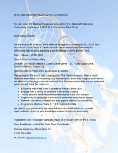 Please see the attached call for artisans and information for the National Indigenous Connectivity Conference & Tech Innovations Trade Show, February 26th – 27th, 2026, at the Grey Eagle Resort & Casino – Event Centre.