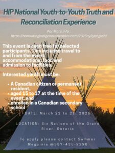An incredible opportunity is available for youth to participate in the HIP National Youth-to-Youth Truth and Reconciliation Experience, taking place March 22–28, 2026, at Six Nations of the Grand River, Ontario.