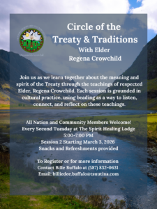 Please see the updated date for Tsuut’ina Health & Wellness’ Circle of the Treaty & Traditions event featuring Elder Regena Crowchild.