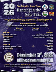 Please see the attached poster for the New Year’s Eve Round Dance – Dancing in the New Year, happening on December 31st, 2025, from 6 PM at the Bullhead Community Hall.