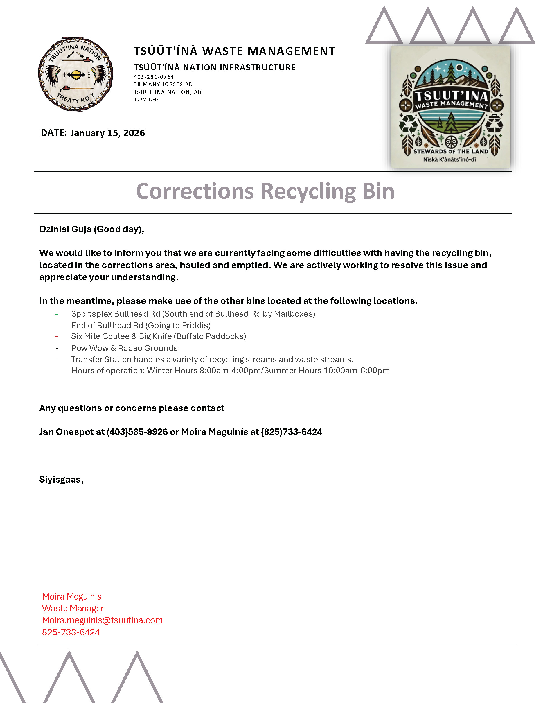 Dzīnísī gújā(Good day), Please see the attached notice regarding the Corrections Recycling Bin on behalf of Tsuut’ina Waste Management. Corrections ...