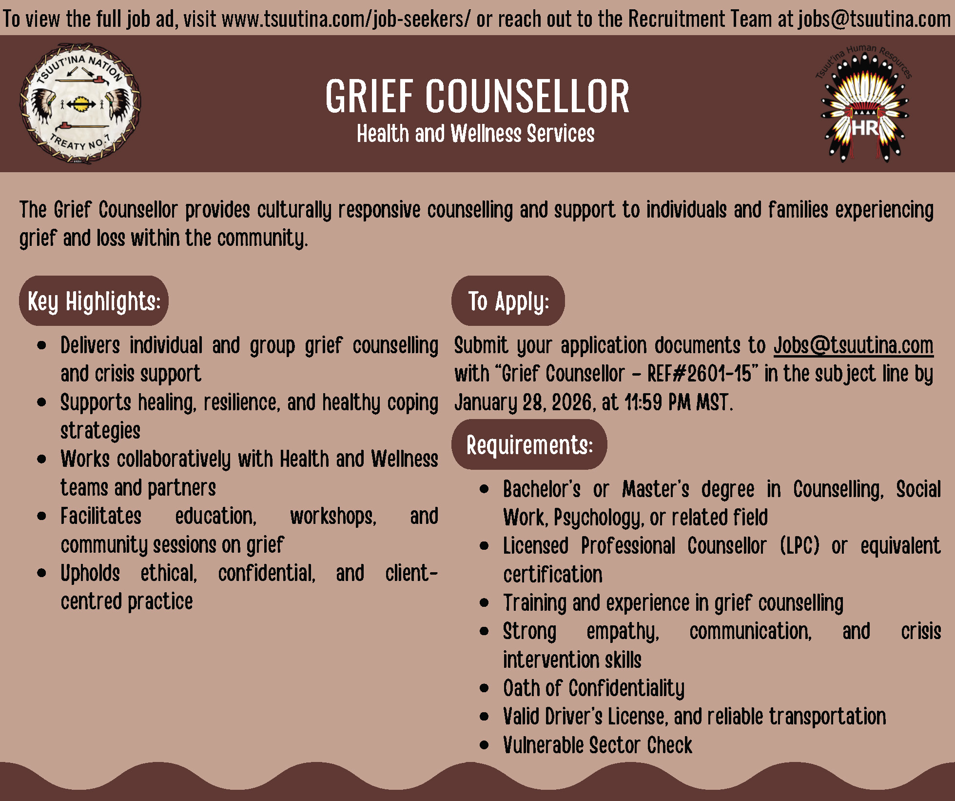 Diyí dzínisà Gújá Nágúdīgòy(Good morning), Please see the attached position summary posters on behalf of Tsuut’ina Human ...