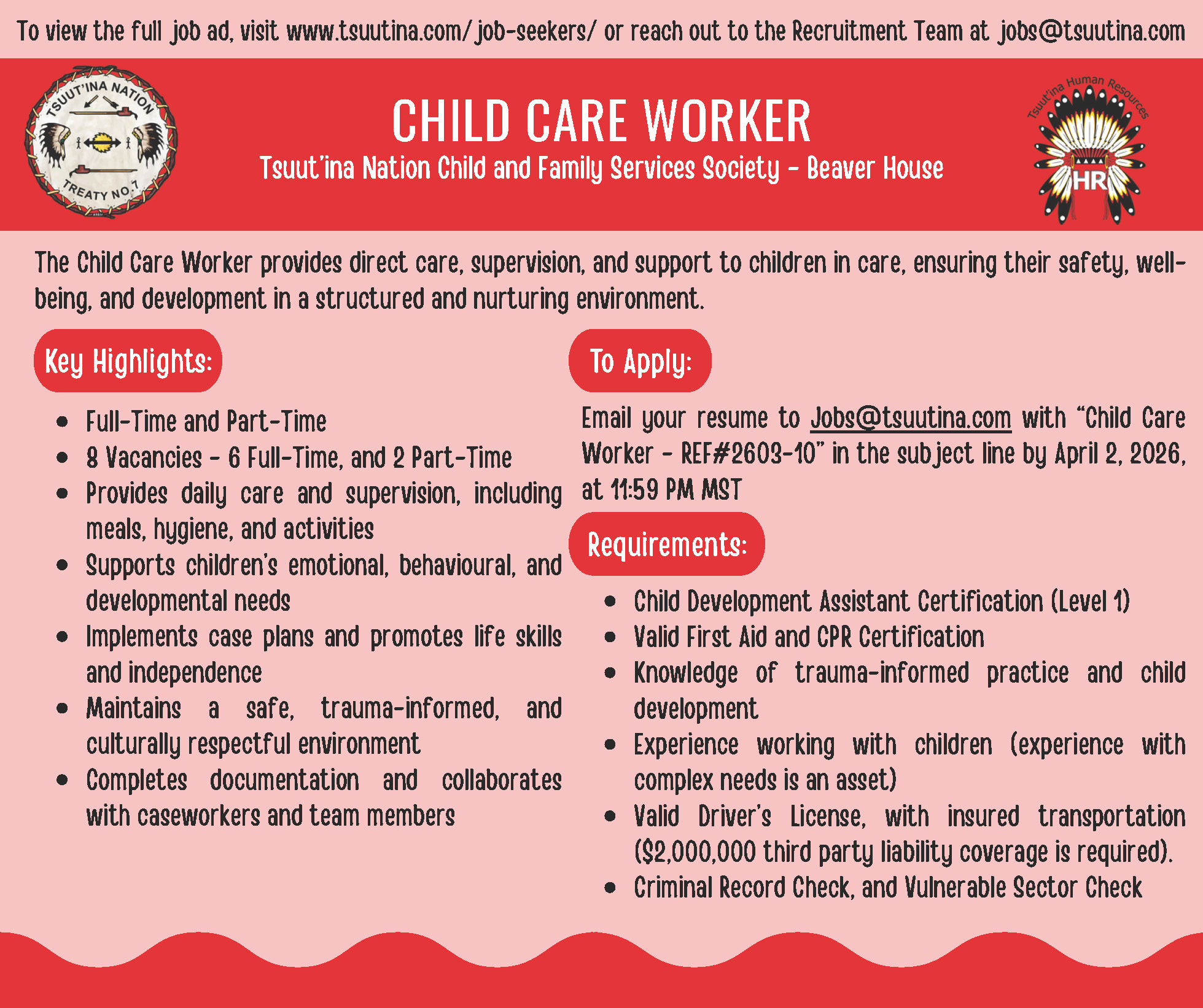 Dzīnísī gújā(Good day), Please see the attached position summary posters for employment opportunities with Tsuut’ina Nation Child and Family Services ...