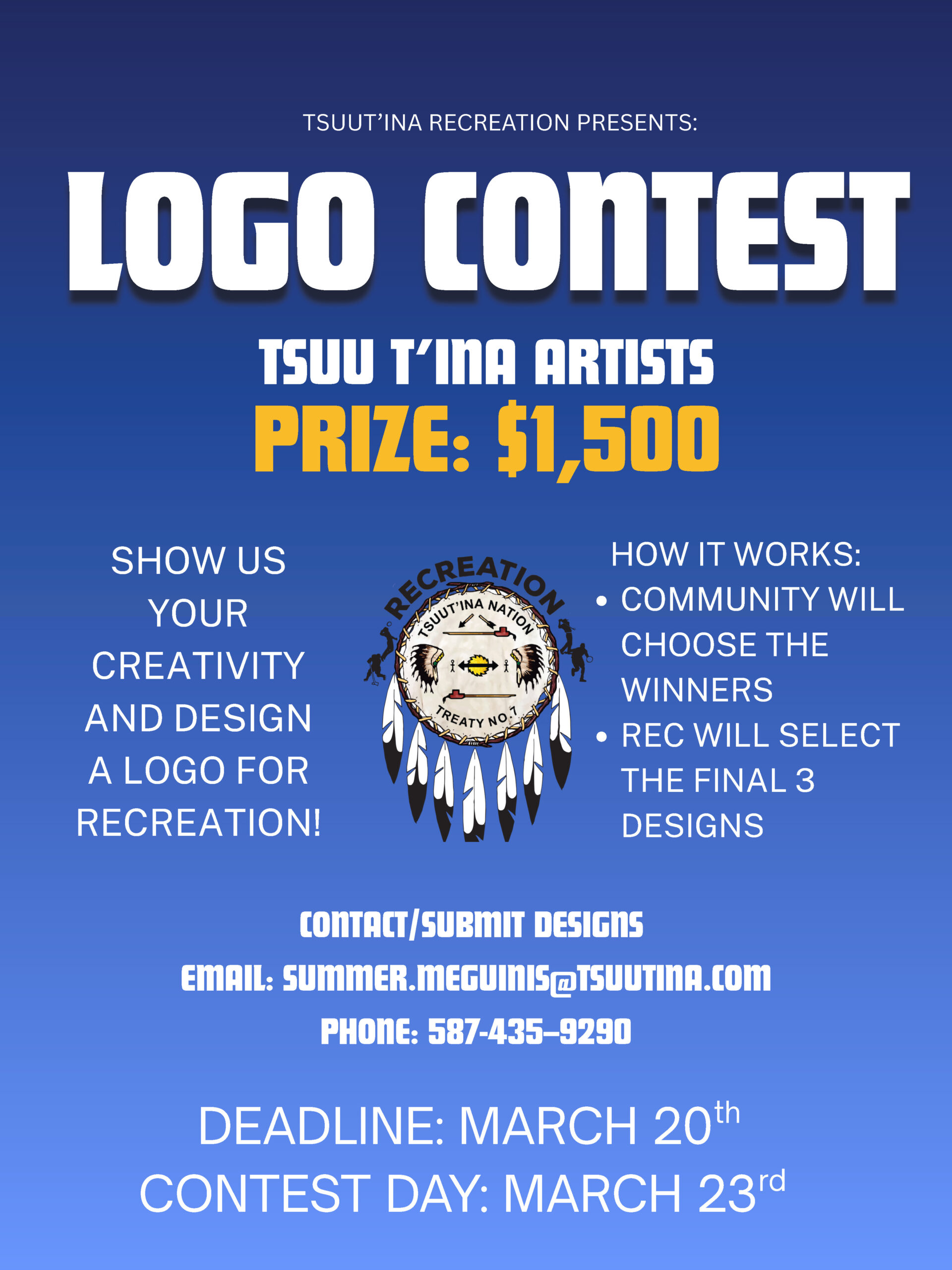 Dzīnísī gújā(Good day), Please see the attached poster for Tsuut’ina Recreation Logo contest. Deadline to submit is March 20th 2026. Recreation ...