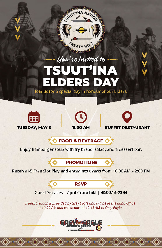 Diyí dzínisà Gújá Nágúdīgòy (Good morning), Please see the attached poster for Tsuut’tina Elders Day. Grey Eagle Resort &...