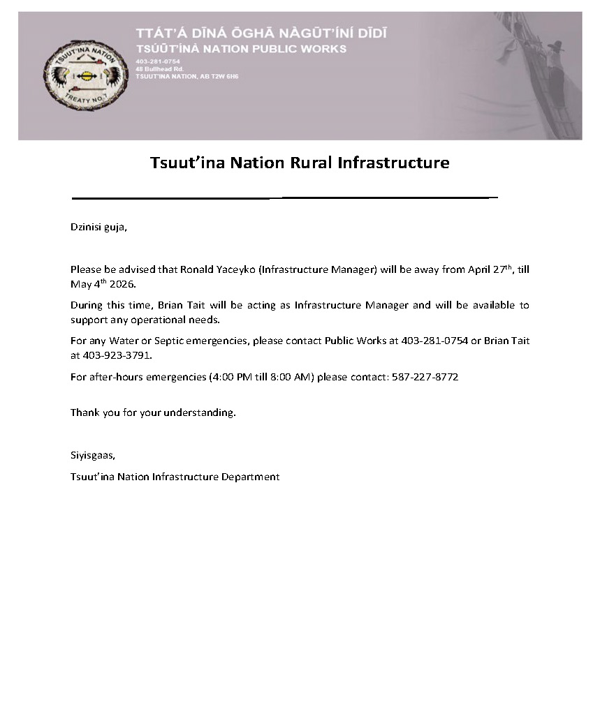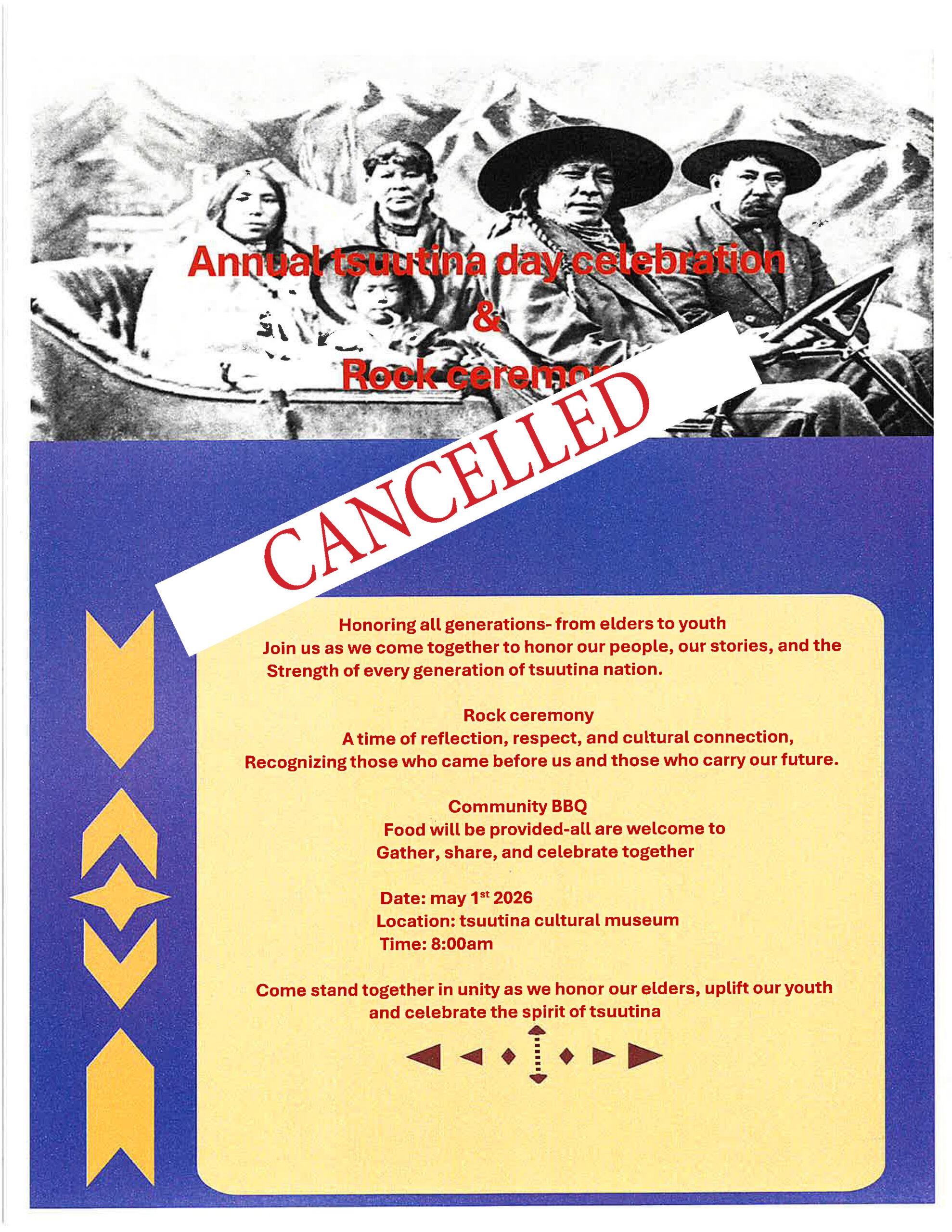 Diyí dzínisà Gújá Nágúdīgòy (Good morning), Please be advised that the Tsuut’ina Day Celebration & Ceremony is cancelled, ...