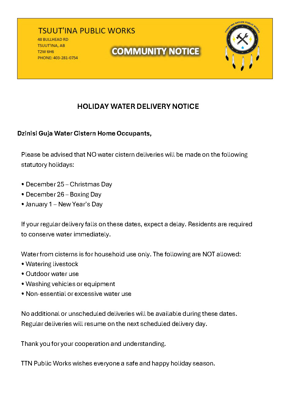 Dzīnísī gújā(Good day), Please see the attached notice from Tsuut’ina Child and Family Services regarding office closure from December 22nd, 2025, ...