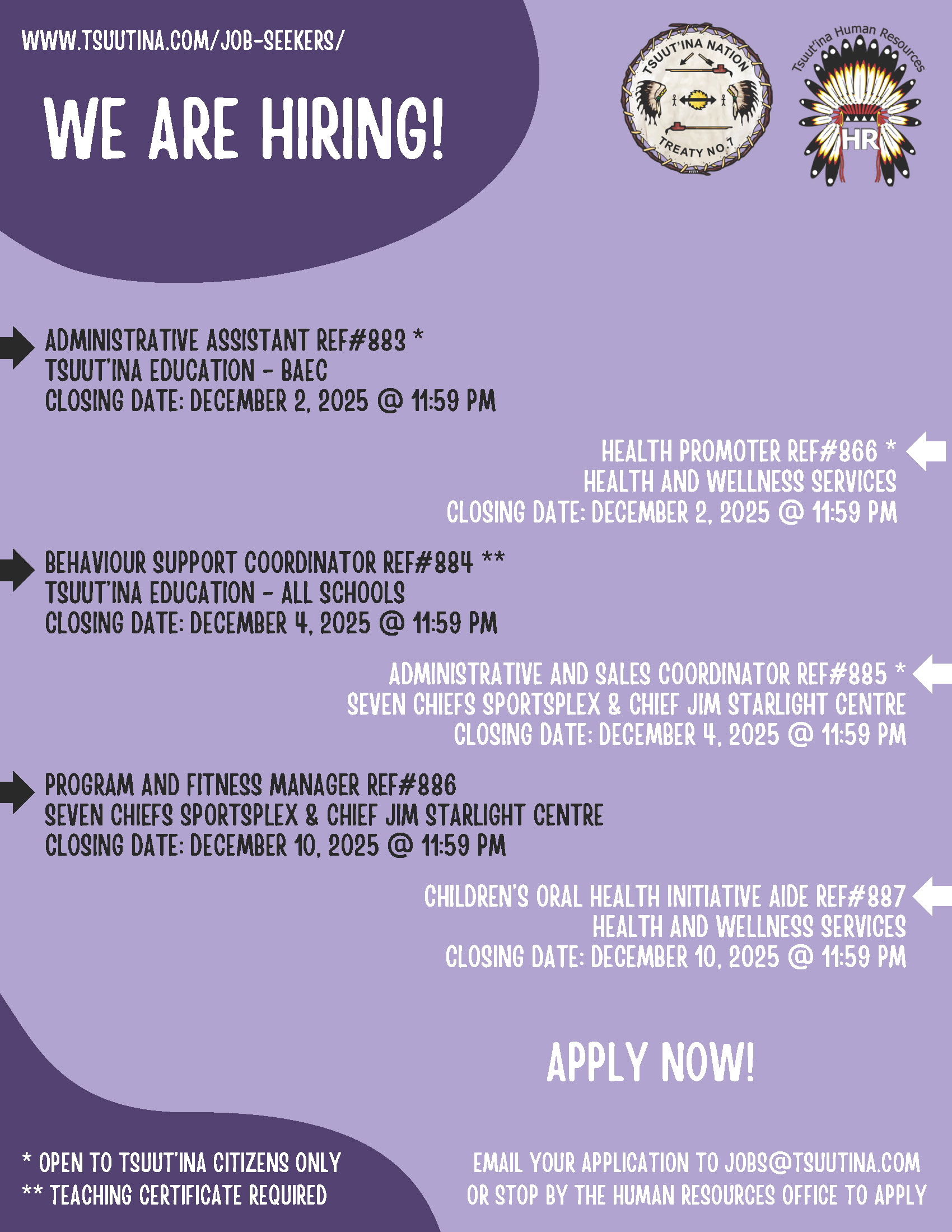 Gújá nágúdīgòy(Good morning), Please see the attached poster for the Tsuut’ina Employment Recruitment. Recruitment Poster – 12.1.2025 Sīyísgá...