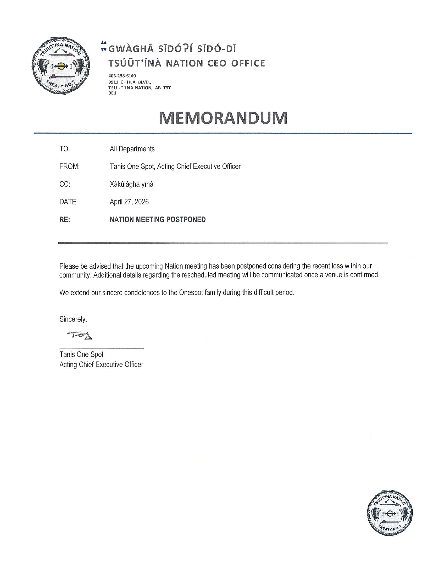 Dzīnísī gújā (Good day), Please see the attached memo regarding the Nation Meeting Postponed. MEMO – Nation Meeting Postponed Sīyísgáà...