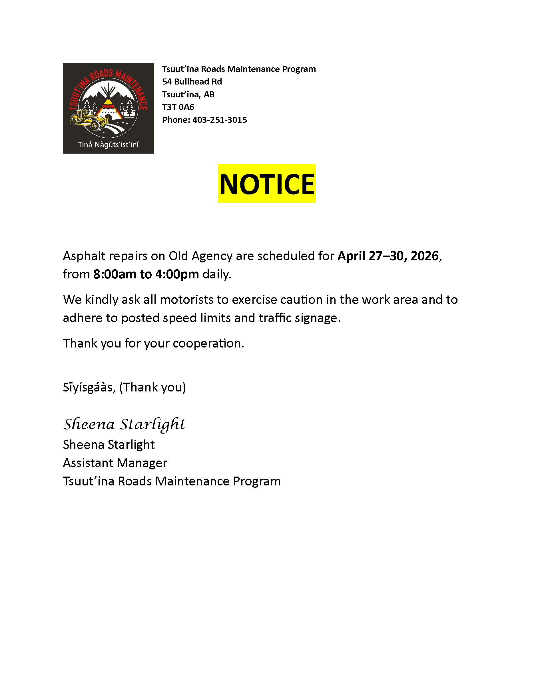 Dzīnísī gújā (Good day), Please see the attached notice regarding Asphalt repairs on Old Agency are scheduled for April 27–30, 2026, from 8 AM to 4 ...