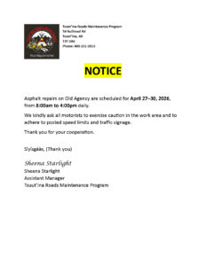 Please see the attached notice regarding Asphalt repairs on Old Agency are scheduled for April 27–30, 2026, from 8 AM to 4 PM daily.