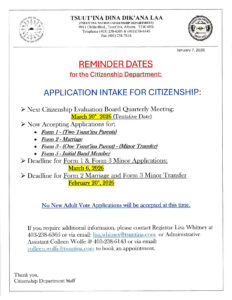 Please see the attached notice on behalf of the Citizenship Department regarding reminder dates for the application intake for Citizenship.