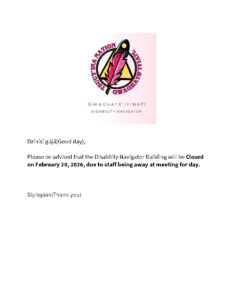 Please be advised that the Disability Navigator Building will be closed today, February 20th, 2026, due to staff being away at a meeting for the day.