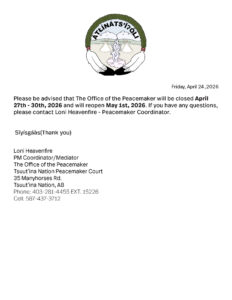 Please be advised that the Office of the Peacemaker will be closed from April 27th – 30th, 2026, and will reopen on May 1, 2026.