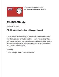 Please see the attached updated Notice from Consultation regarding Elk Meat Distribution for Nation Elders and persons with disabilities.